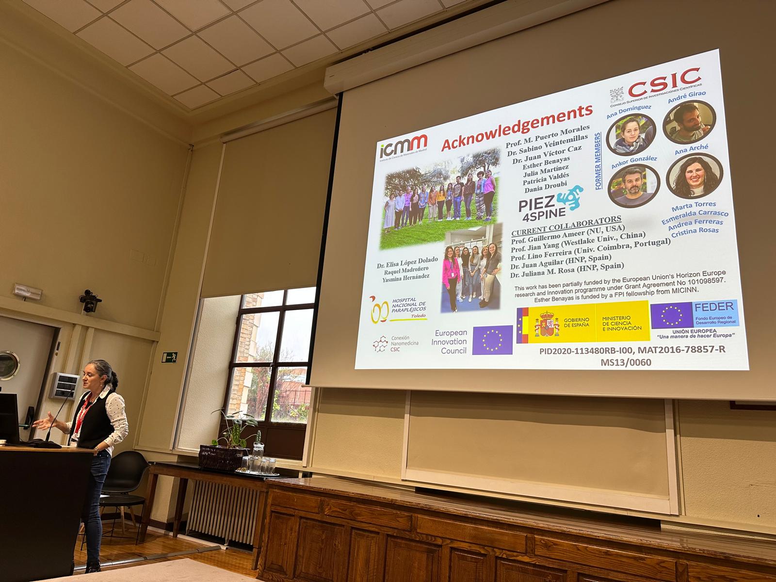 We are proud that our coordinator, María Concepción Serrano (ICMM-CSIC), delivered an oral presentation at this year’s Nanomed-CSIC Assembly. Her talk, “Novel strategies for neural repair after spinal cord injury,” presented ongoing Piezo4Spine research using advanced biomaterials and mechanobiology to promote neural repair.